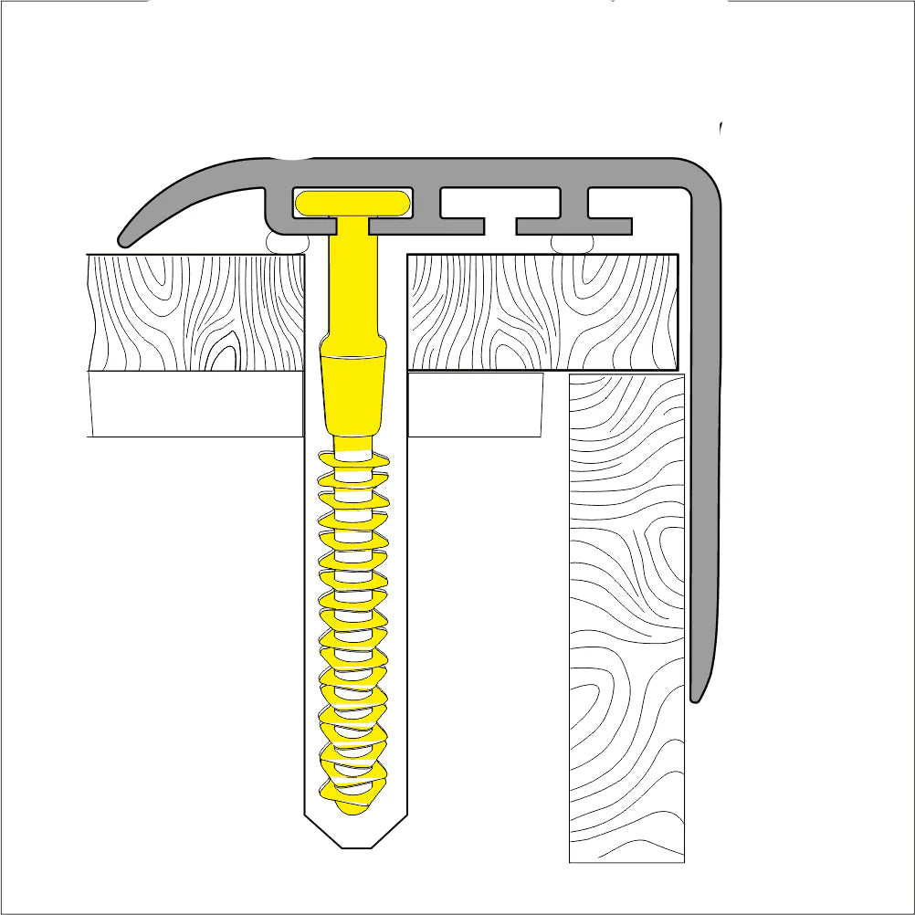 Designed with hidden fixings, this stair nosing maintains a smooth and uninterrupted look. Installation is simple—drill the mounting holes, position the included Mycks plugs inside the underside channels, align, and press firmly into place. The adhesive layer forms a stable bond between the stair and the trim for a neat, long-lasting result.